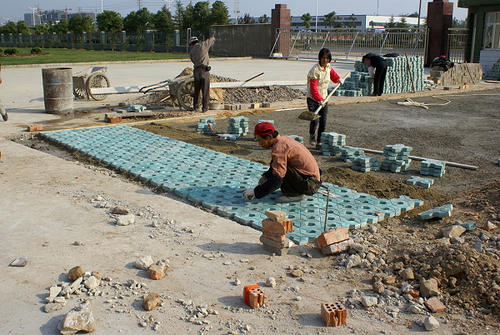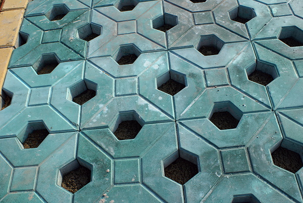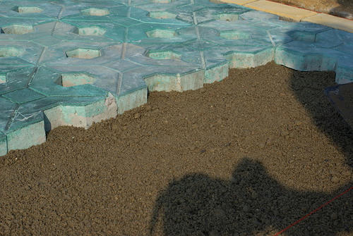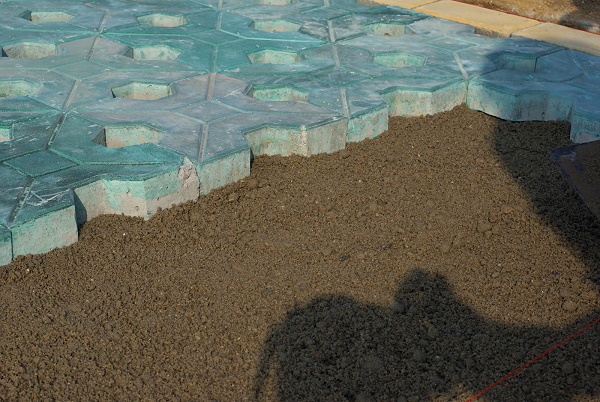 ▼ 花磚底下是2cm的細砂石拌一點水泥,再下一層就是6cm的混凝土層,這樣可以確保停車位長久不凹陷。