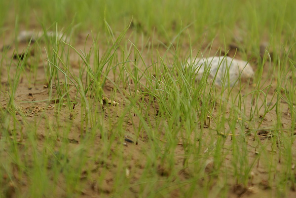 ▼ 播完種後連續下了一個多禮拜的雨,雜草長得奇快,一下子就整片綠油油了。