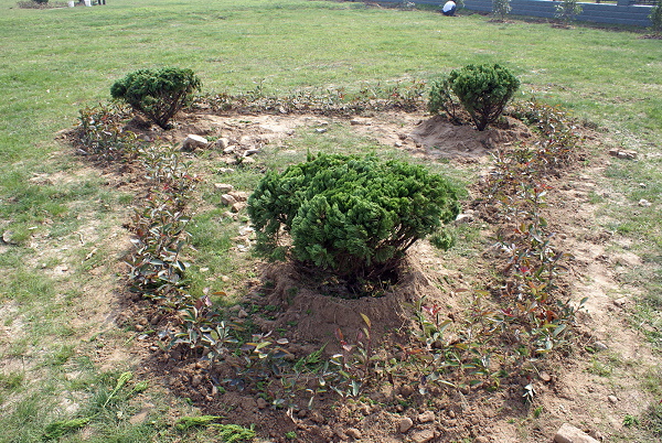 ▼ 中央大綠化帶剛好被排水溝分成三區塊,每個區塊中心種三株[龍柏球],繞著球再種[紅葉石楠]