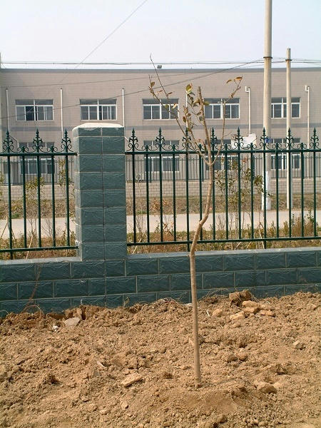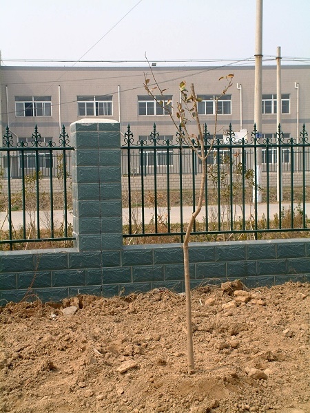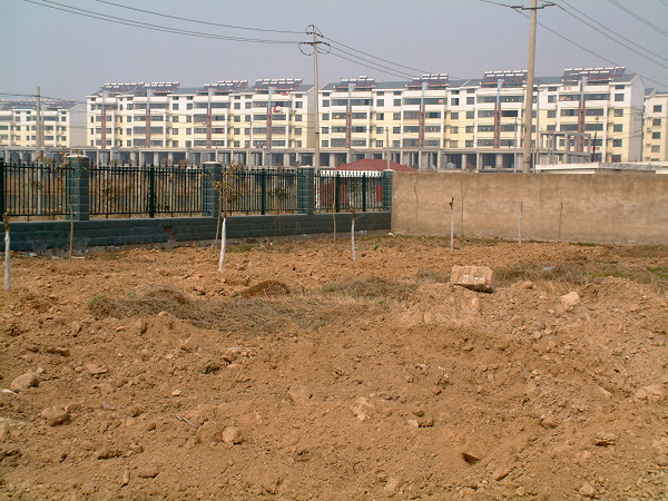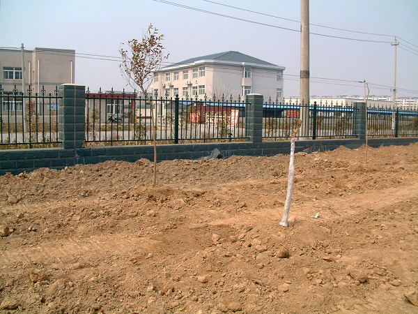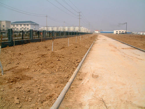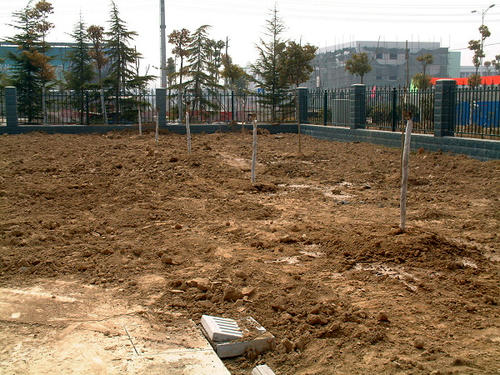 畫面上栽種的是紫薇(前排,直徑3cm,30元/株)與大葉女貞(後排,直徑4cm,25元/株)。每6米一株,紫薇距道路2米,大葉女貞距圍牆4米,還有銀杏(直徑8cm,160元/株)尚未種下。