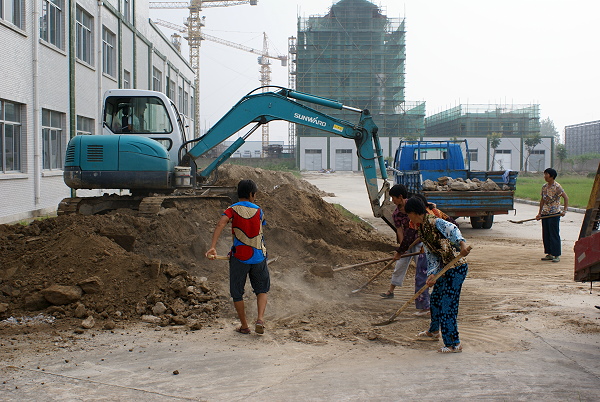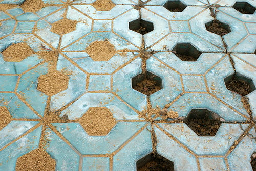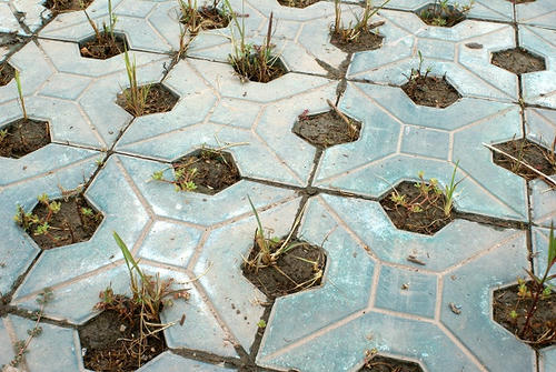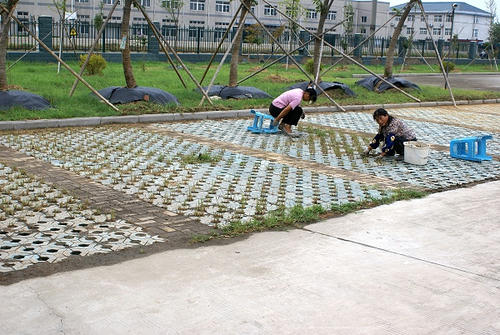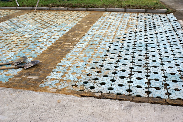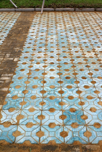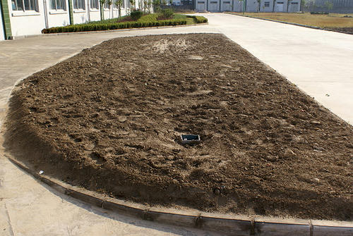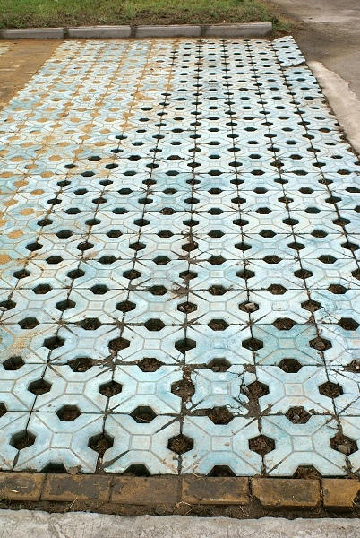 停車場地磚的孔內雜草不好清除,所以乾脆挖掉土改換成黃沙(以前工程有剩),往後比較不容易長植物。