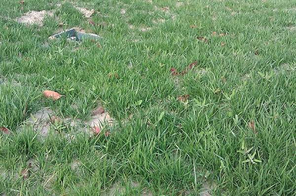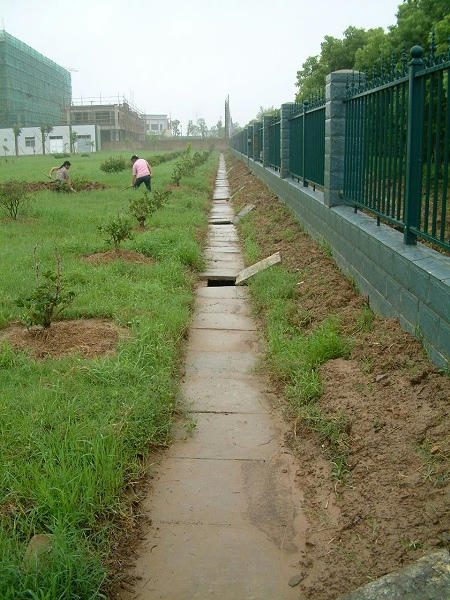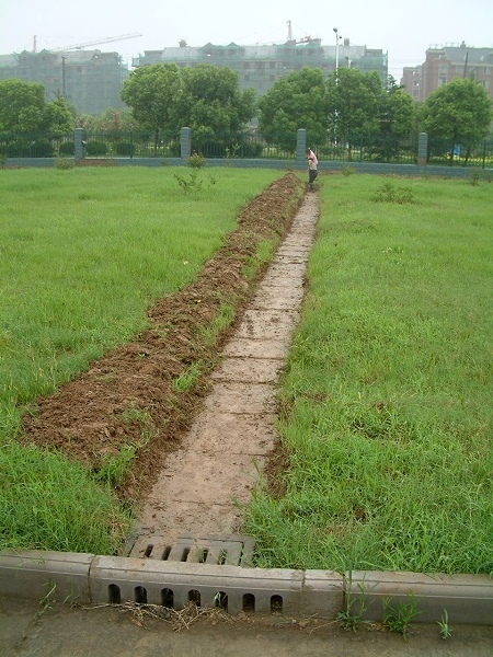 連續幾天下雨,為後續草坪重新舖設做前置作業,將原本綠化帶的暗溝掘出,並增挖幾條明溝利於排水速度,避免往後再度發生水淹草坪的狀況。